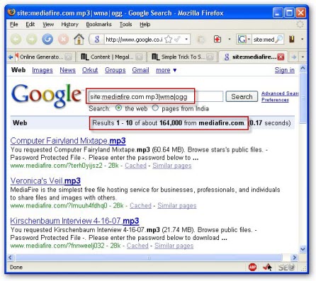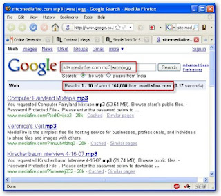 For Example, to search all music files hosted on MediaFire type this in Google:
